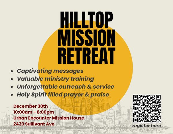 The Hilltop Mission Retreat is designed for High Schoolers interested in serving the community of the Hilltop and growing in evangelization. Urban Encounter and The Ark Youth Group (as well as any other youth groups interested) are partnering together for this event. We will have a time for messages, street evangelization, and service. 10 service hours will be rewarded for those who attend. We will culminate with our New Believers event which is a weekly bible study and free meal event we do every Tuesday from 6-9pm.